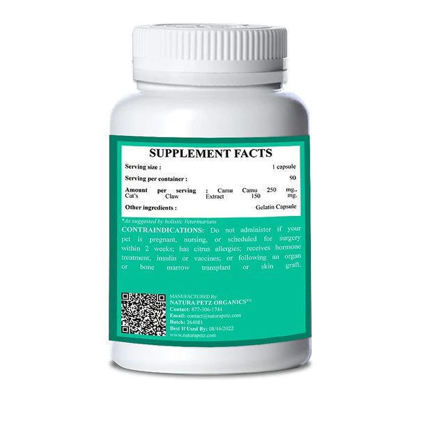 Gelatin Capsules, Myrciaria Dubia (H.B.K.) Mcvaugh Camu Camu, Cat’s Claw Extract Uncaria Tomentosa Extract Cat’S Claw, Vitamins A, B1, B2, B3, C, Selenium, Calcium, Leucine, Protein, Serine, Thiamin, Valine. Mixed Carotenoids, Lutein, Astaxanthin And Zeaxanthin; Glucose, Potassium, Phosphorous And Iron. Turkey Flavored Capsules.