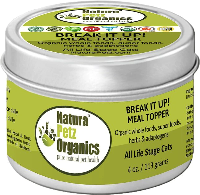 Help keep crystals from developing in your kitty with Natura Petz Organics Break It Up! Cat Food Topper. This tasty turkey-flavored homeopathic medicine is formulated to help break down and eliminate all types of stones including liver, kidney, bladder and gall stones, gravel, crystals, grains and calculi. It contains antilithic, anti-inflammatory, anti-spasmodic, anti-bacterial, anti-fungal, anti-viral, plant steroids and adaptogens. Crafted without any corn, wheat, soy or GMO ingredients in a convenient powder form, Break It Up may help permanently limit stone formation, block cellular irregularity in the bladder and kidneys and normalize liver enzyme levels.