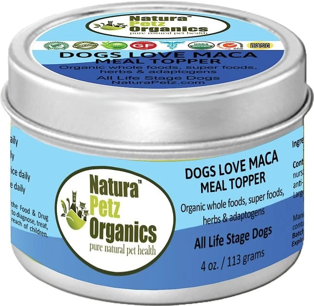 Get your buddy back to feeling his best with Natura Petz Organics Dogs Love Maca Gland, Stress Regulator & Homeostasis Support Dog Food Topper. This tasty turkey-flavored supplement for dogs is formulated to help restore whole body balance using nutrients and phytochemicals. It contains a proprietary blend of organic walp maca tri-blend, algarroba carob bean, chuchuhuasi, suma, pollen and honey. Crafted without any corn, wheat, soy or GMO ingredients in a convenient powder form, Dogs Love Maca may help nourish gland health, regulate stress response and support proper metabolic rates.