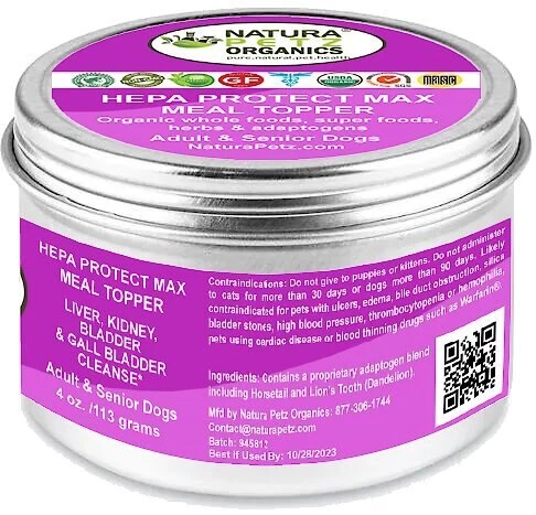 Bring your pup’s body into balance with Natura Petz Organics Hepa Protect Max Dog Supplement. This plant-based supplement offers broad support for your dog’s kidney, liver and gallbladder functions—along with cardiovascular, digestive, endocrine, hormonal and neurological health. It works to naturally combat a variety of liver and kidney disorders including hepatic lipidosis, hepatitis and Fatty Liver Disease (FLD)—and may help fight bladder, kidney and urinary tract infections. Hepa Protect Max promotes good health from nose to tail including strong skin, tissue, bones, claws and fur. It may even help reduce toxins in your dog’s body caused by poor water quality, over-processed foods, environmental conditions, and more. Talk to your vet and see if Hepa Protect Max is the paw-fect choice for your pooch!