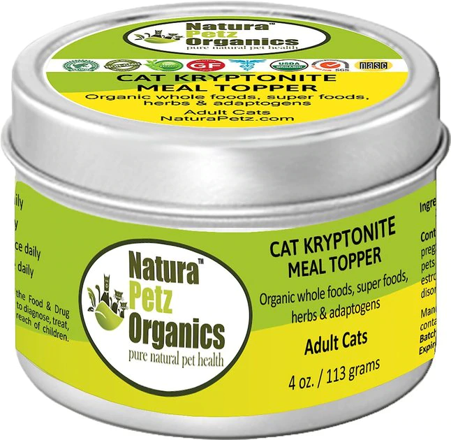 Help keep your cat feeling cool with Natura Petz Organics Kryptonite Cat Food Topper. This tasty turkey-flavored supplement for adult and senior cats is formulated to help deliver vital nutrition to thyroid and adrenal glands. It contains a blend of alterative and adaptogenic herbs designed to strengthen endocrine support. Crafted without any corn, wheat, soy or GMO ingredients in a convenient powder form, Kryptonite may help regenerate stressed or underperforming glandular functions and limit diseases caused by metabolic dysfunction such as Cushing’s and Addison’s.