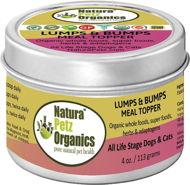 Help protect your animal amigo from abnormal growths with Natura Petz Organics Lumps & Bumps Dog & Cat Food Topper. This tasty turkey-flavored supplement for dogs and cats is formulated to help provide a layer of protection against cysts, fatty sebaceous tumors, lipomas and irregular growths. It contains a blend of vital adaptogens, plants, fruits, super foods, vegetables, vitamins, minerals, antioxidants, fatty acids, digestive enzymes, prebiotics, probiotics and more. Crafted without any corn, wheat, soy or GMO ingredients in a convenient powder form, Lumps & Bumps may help promote balanced immune health, optimize overall wellness and limit blood vessels in or around growths and masses.