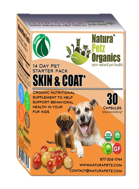 Get your doggo looking his best with Natura Petz Organics Skin & Coat Starter Dog Supplement. This tasty turkey-flavored supplement for dogs is formulated to help nourish skin and strengthen hair follicles in your dog’s coat. It contains a blend of super foods, berries, herbs, amino acids, antioxidants, vitamins and minerals, probiotics and natural plant chemicals. Crafted without any corn, wheat, soy or GMO ingredients in a convenient capsule form, the Skin & Coat Starter pack may help limit free radical scavenging, stimulate collagen production and promote a solid nutritional foundation for all body systems.