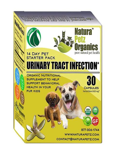 Help defend your doggo from UTIs with Natura Petz Organics Starter Pack Homeopathic Medicine for Urinary Tract Infections (UTI) for Dogs. This tasty turkey-flavored medicine for dogs is formulated to help address urinary tract, bladder and kidney infections. It contains a proprietary blend of herbs and plant botanicals including chanca piedra and anamu. Crafted without any corn, wheat, soy or GMO ingredients in a convenient capsule form, the Natura Petz Organics Starter Pack Homeopathic Medicine for Urinary Tract Infections (UTI) for Dogs may help alleviate pain, tone connective tissue in the bladder and rebuild proteoglycan and glycosaminoglycan content.