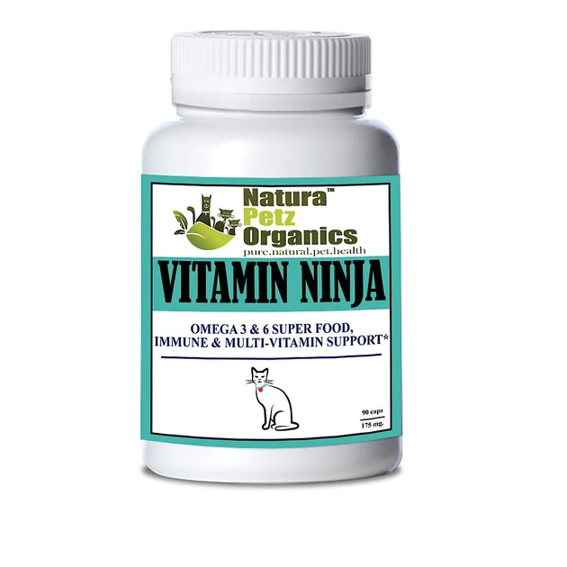 Teach your kitty the ancient art of cat-fu defense with Natura Petz Organics Vitamin Ninja Cat Supplement. This tasty turkey-flavored supplement for cats is formulated to help fight infections and protect against auto-immune diseases. It contains a blend of protein, vitamins, minerals, amino acids, chlorophyll, carotenoids, antioxidants, resveratrol, co-factor enzymes, flavonoids, adaptogens, phytonutrients and more. Crafted without any corn, wheat, soy or GMO ingredients in a convenient capsule form, Vitamin Ninja may help promote heart health, support native gut flora and limit allergies.