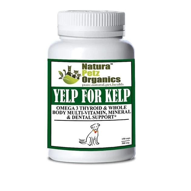 The Natura Petz Organics Yelp For Kelp Dog Supplement promotes digestive health in your dog in multiple ways. This prebiotic and probiotic nutritional supplement includes fish oil, fatty and amino acids, digestive enzymes and vitamins C, E and K. It supports immune system health and promotes healthy teeth. It may help to reduce hypothyroidism symptoms, while promoting bone marrow, spleen and gastrointestinal health. This supplement supports balanced intestinal, digestive and immune systems. It may also boost skin, bone, coat, connective tissue and joint health for a happy, healthy dog.