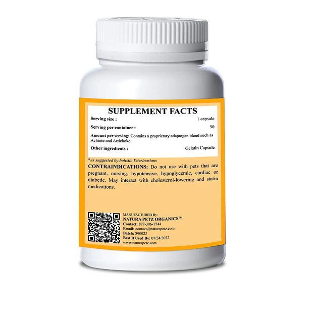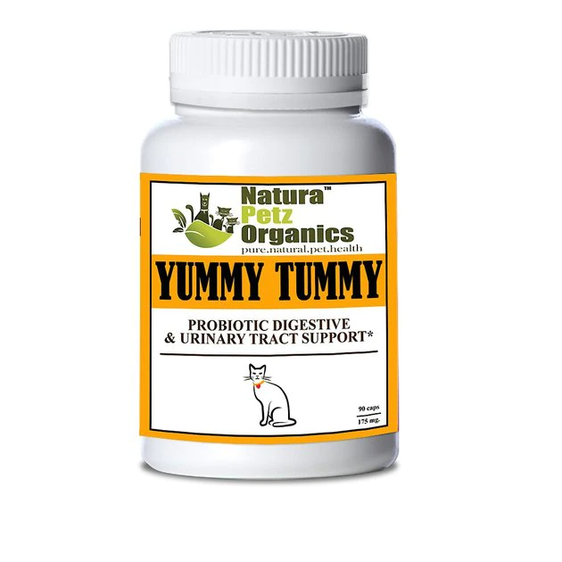 Help keep your kitty feeling happy and healthy with Natura Petz Organics Yummy Tummy Cat Supplement. This tasty turkey-flavored supplement for cats is formulated to help support digestive and urinary tract health.Β It contains a blend of natural plant probiotics, glycosaminoglycans, FOS , digestive enzymes, fiber, plant based steroids, inulin, geraniin, phytochemicals, flavonoids, alkaloids and more. Crafted without any corn, wheat, soy or GMO ingredients in a convenient capsule form, Yummy Tummy may help calm upset stomachs, normalize pH-balance in urine and relieve frequent urination.
